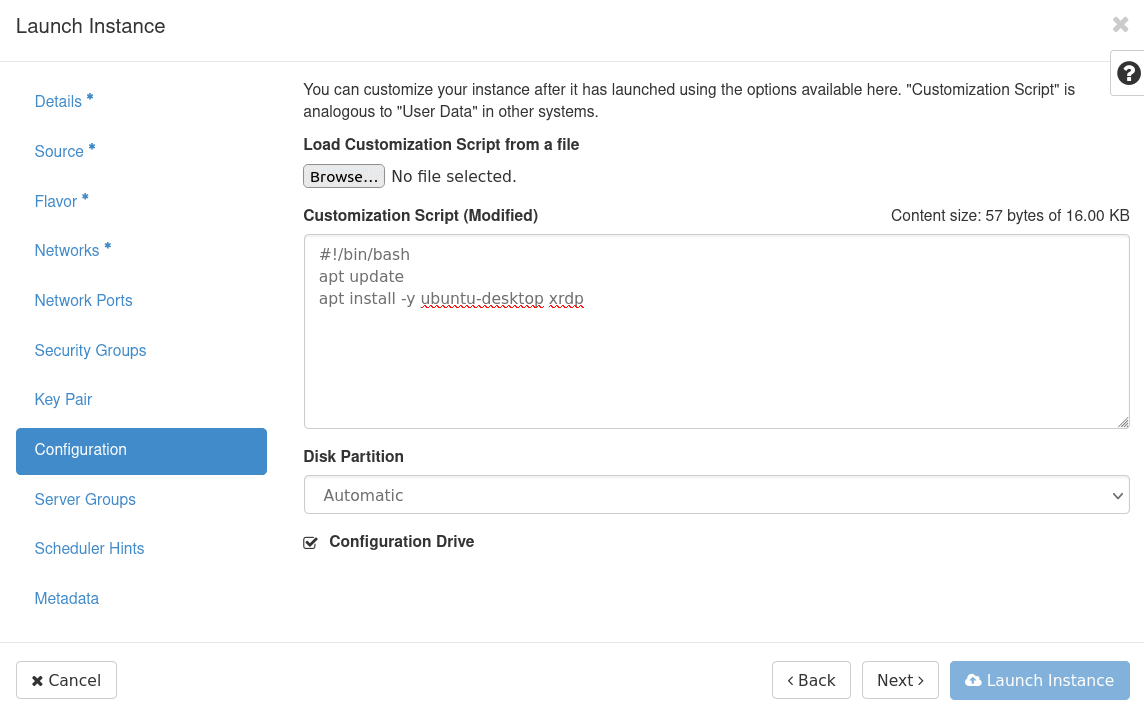 Customization Script. The minimal version of the script for Ubuntu linux looks like this:#!/bin/bash apt update apt install -y ubuntu-desktop xrdpExample