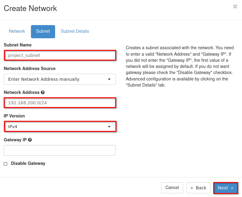openstack subnet create --network project_network --subnet-range 192.168.200.0/24 project_subnetAdditional subnet configuration is available in official CLI documentation.