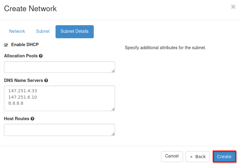 3. For the last tab Subnet Details just check that a DNS is present and the DHCP box is checked, alternatively you can create the allocation pool or specify static routes.