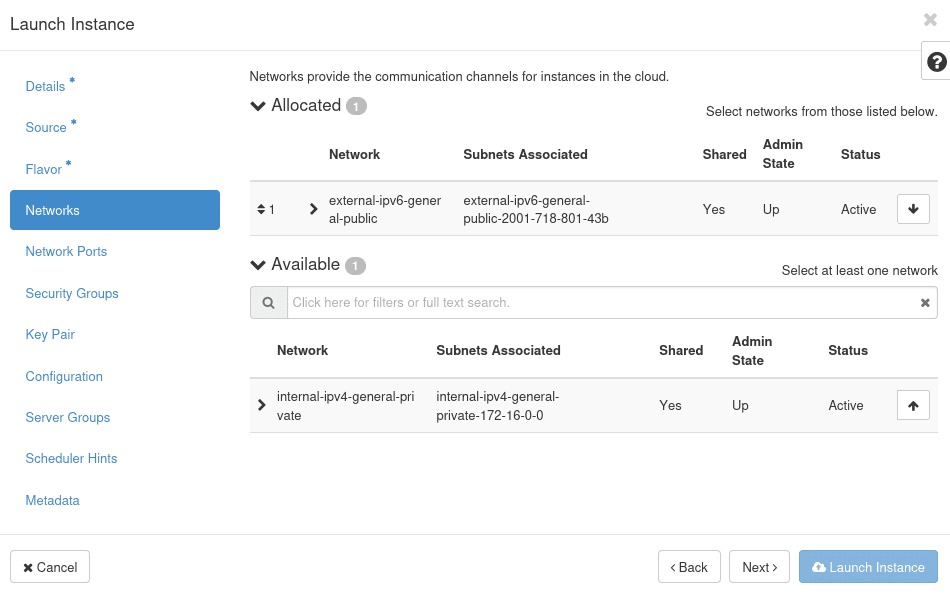 To enable both IPv4 and IPv6 connectivity, select first the internal IPv4 network internal-ipv4-general-private and then add second network port using external-ipv6-general-public network in the Networks section when launching a new instance.