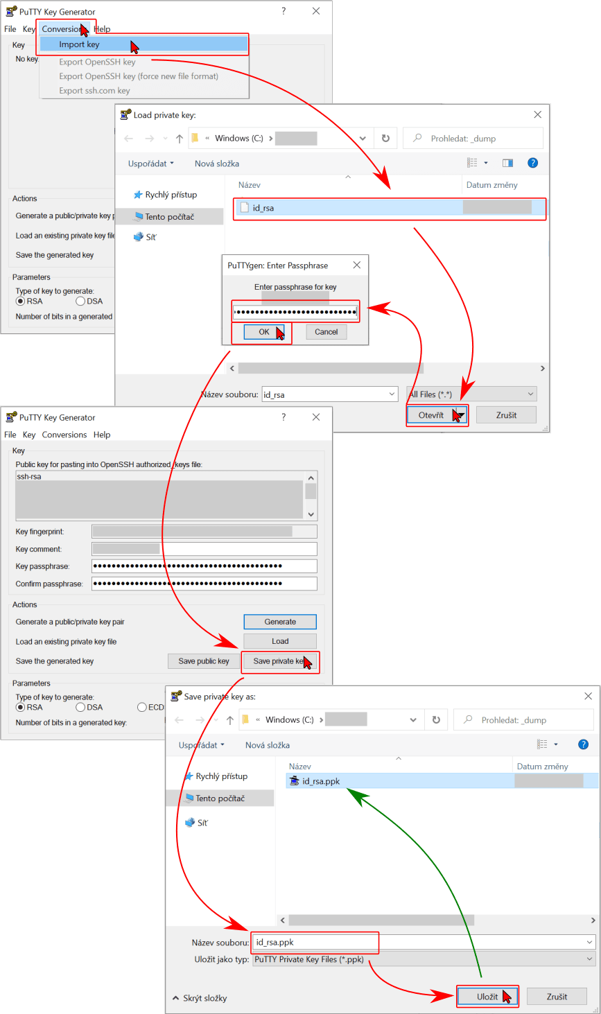 - Run PuTTYgen, in the menu Conversion -> Import key browse and load your OpenSSH format id_rsa private key using your passphrase