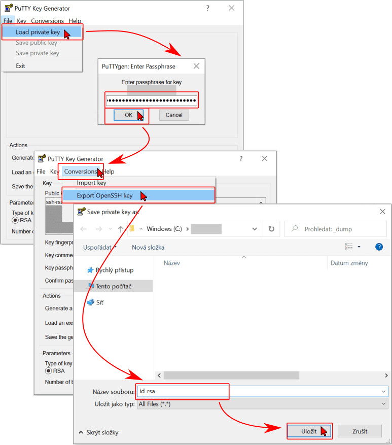 - In the menu Conversion -> Export OpenSSH key browse destination for OpenSSH format id_rsa and save file